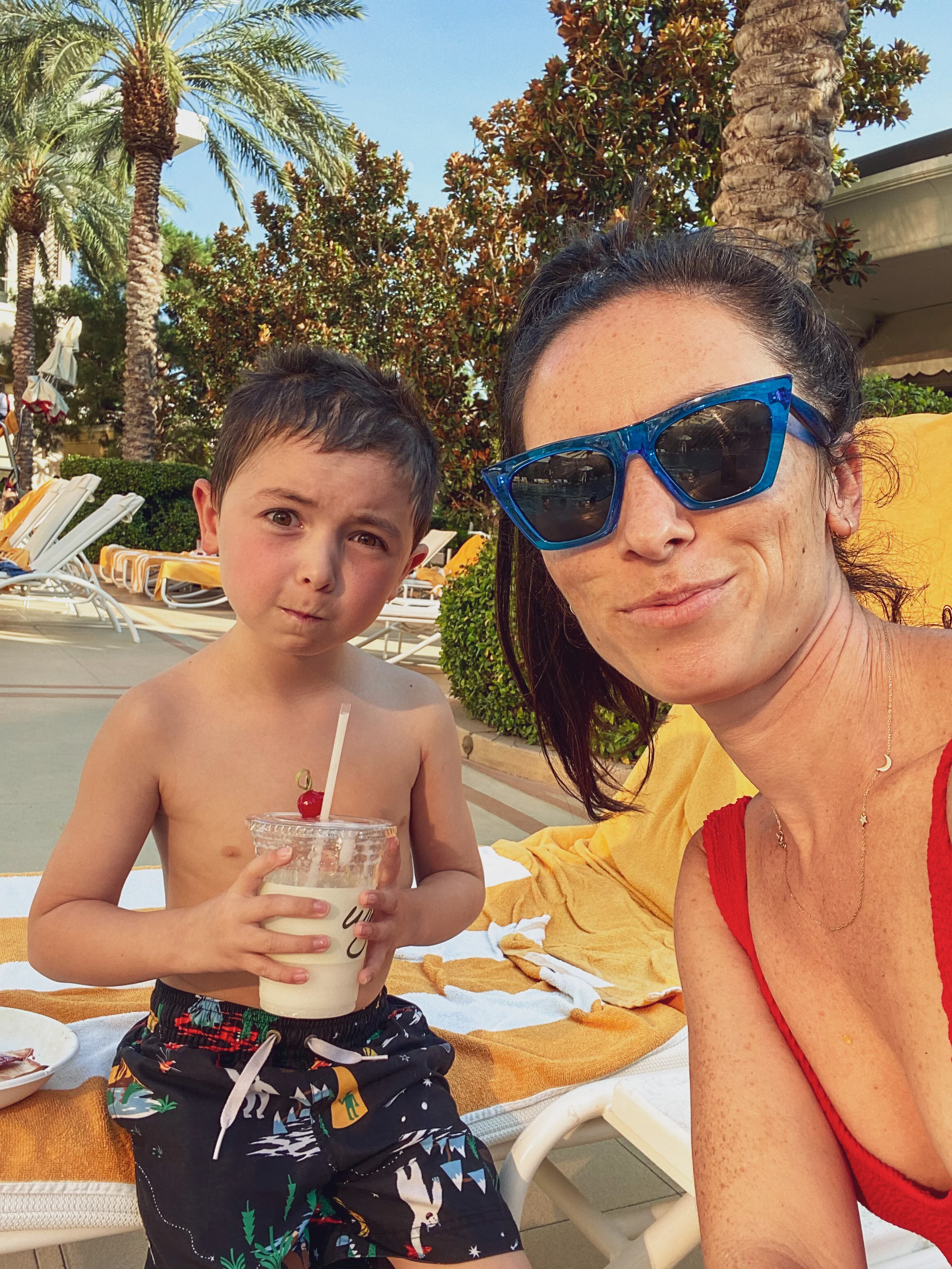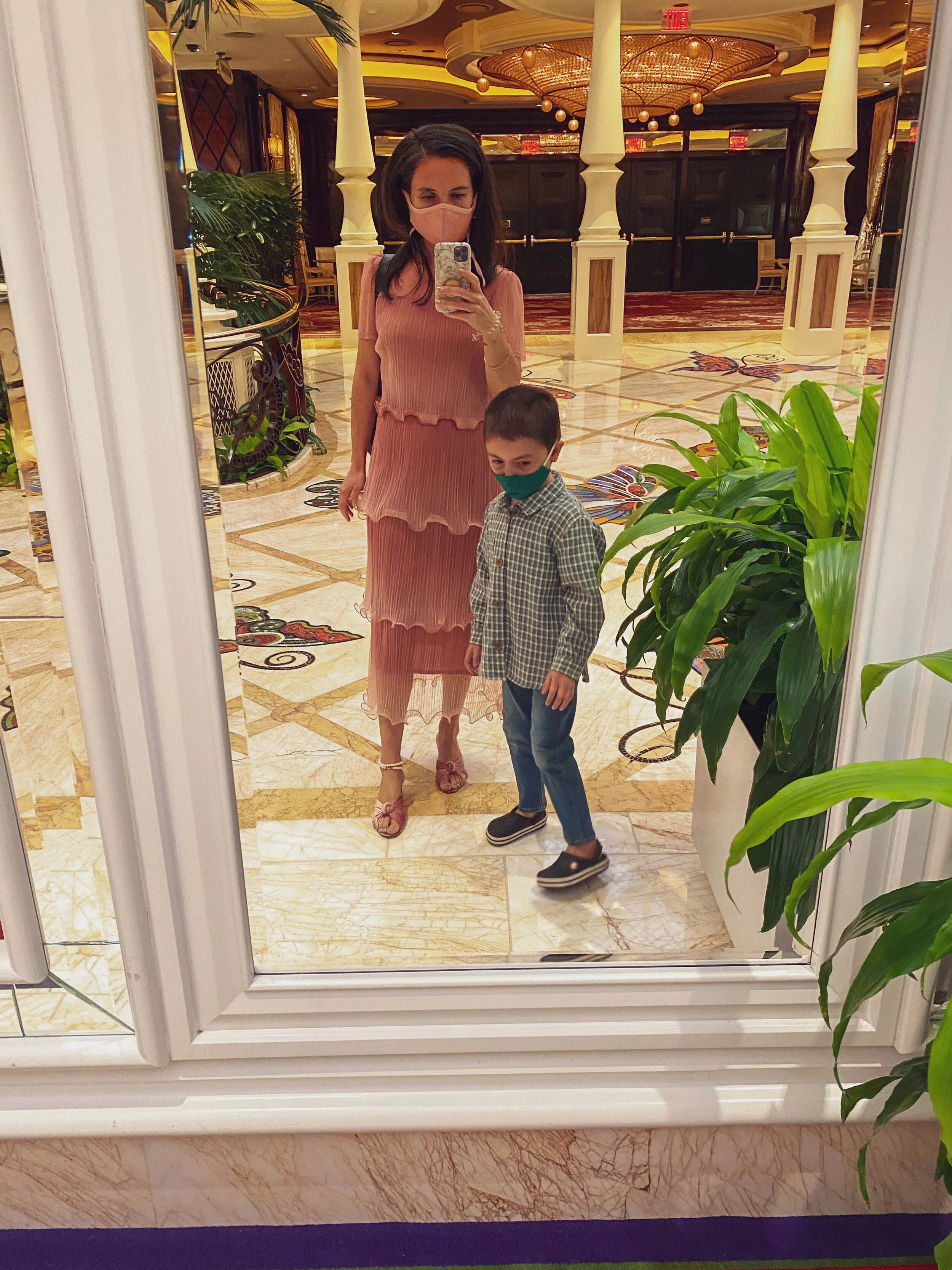If you could fly anywhere right now where would it be? I know many of us are craving an escape from our homes and have lists of far off and beautiful places. I am sure last on your list would be Las Vegas. For many reasons. But as fate would have it, last month Mike had a trip to Vegas for a few commercials he was directing. Given my new job status and Mario’s adaptable virtual schooling Momo and I packed up school supplies, swimsuits, fun outfits and even some heels (!) on a one way ticket to meet him in Nevada for the week. SURPRISE! we are assholes :/